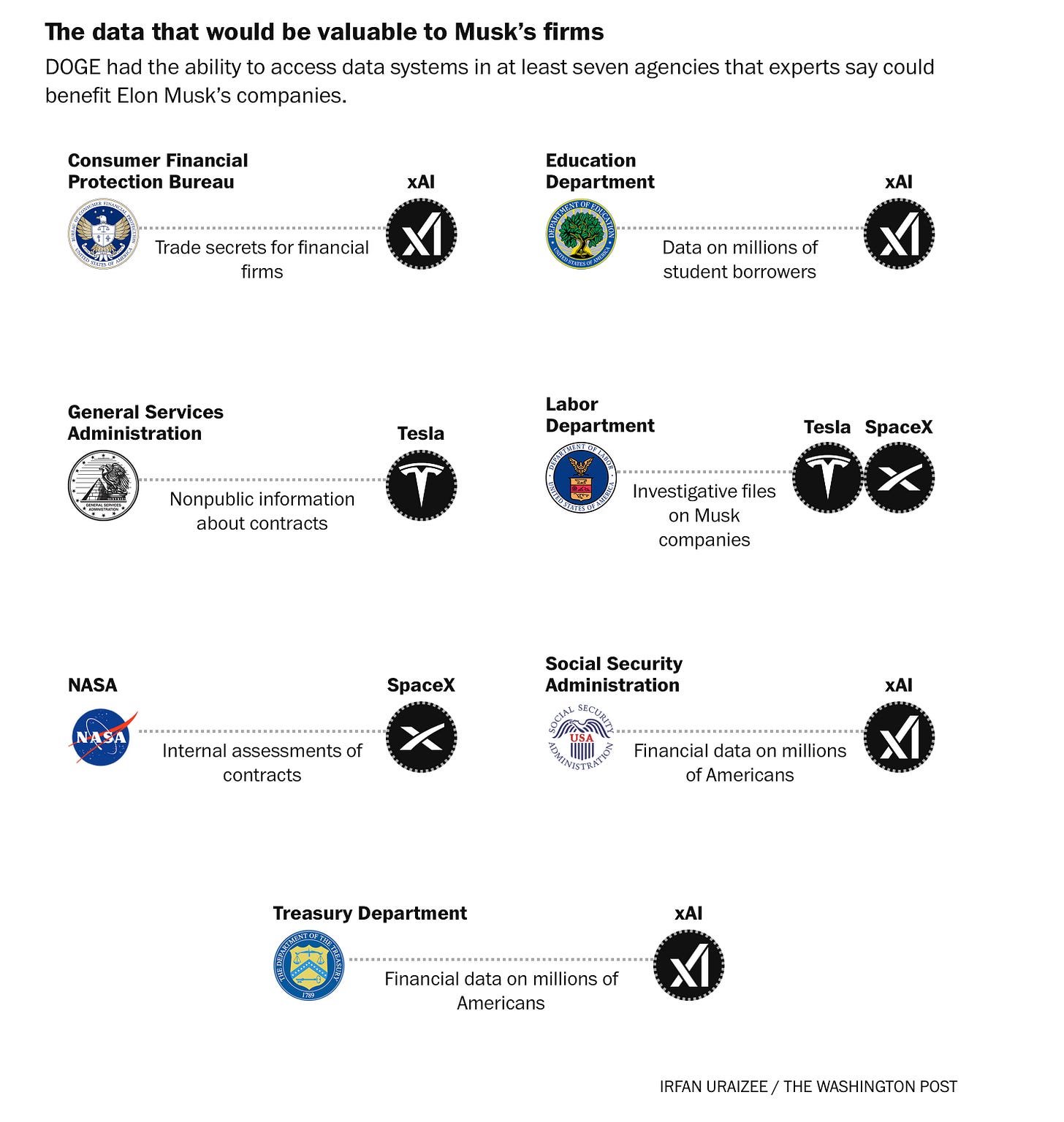 Washington Post: In at least seven major departments or agencies, DOGE secured the power to view records that contain competitors’ trade secrets, nonpublic details about government contracts, and sensitive regulatory actions or other information.
